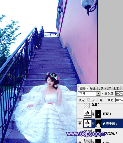 Photoshop调出楼梯婚片艳丽的蓝紫色(6)
