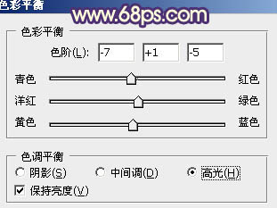 4、创建色彩平衡调整图层,对阴影,高光进行调整,参数设置如图7,8,效果如图9。这一步简单加强图片的层次感。