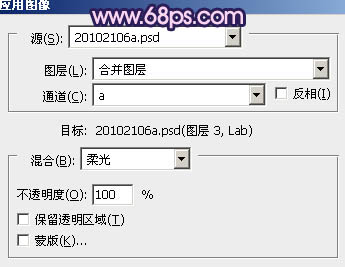 3、新建一个图层,盖印图层。执行:图像 > 应用图像,参数设置如图10,效果如图11。确定后选择菜单:图像 > 模式 > RGB颜色,选择不合拼。这两步操作只是调整背景颜色,人物部分有点偏色,后面会修复。