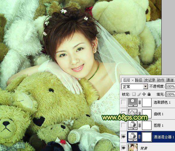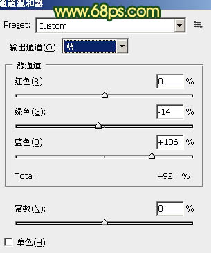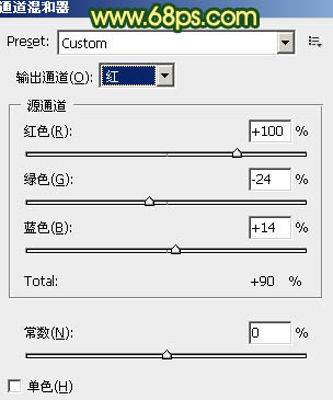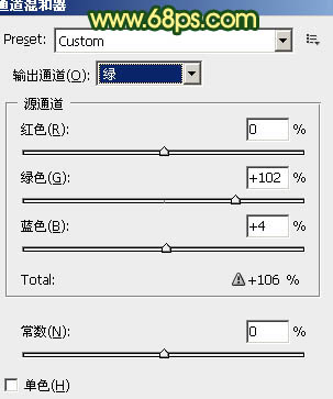 1、打开原图素材,创建通道混合器调整图层,对红,绿,蓝进行调整,参数设置如图1 - 3,效果如图4,这一步操作是给图片添加一些淡绿底色。