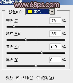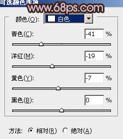 5、创建可选颜色调整图层,对黄,白进行调整,参数设置如图7,8,效果如图9。