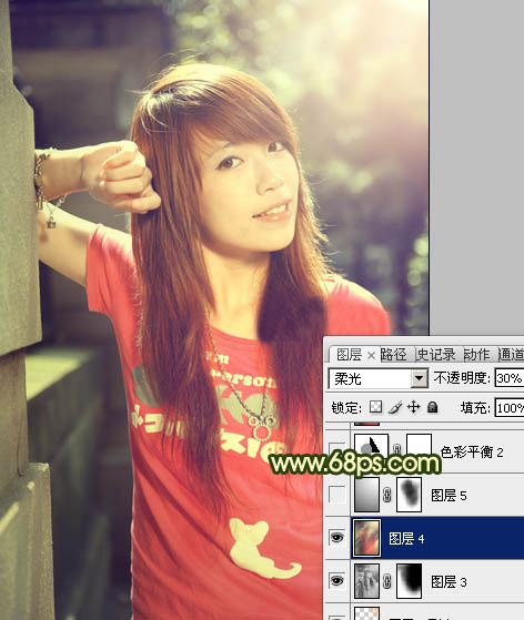 12、新建一个图层,盖印图层。执行:滤镜 > 模糊 > 高斯模糊,数值为5,确定后把图层混合模式改为“柔光”,不透明度改为:30%,效果如下图。这一步是给图片柔化处理。