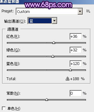 1、打开原图素材,创建通道混合器调整图层,对红,蓝进行调整,参数设置如图1,2,效果如图3。这一步操作非常重要,用通道混合器调整,可以快速把画面的色彩调成蓝色或其他底色,方便以后再次调色。