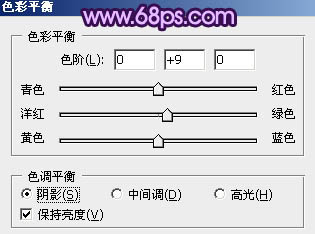 7、保持选区,创建色彩平衡调整图层,对阴影、中间调、高光进行调整,参数设置如图13 - 15,效果如图16。这一步是把树叶部分的颜色调绿一点。