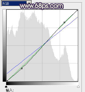 4、创建曲线调整图层,对RGB及蓝色进行调整,参数设置如图7,8,效果如图9。这一步是加强图片的青色与黄色。