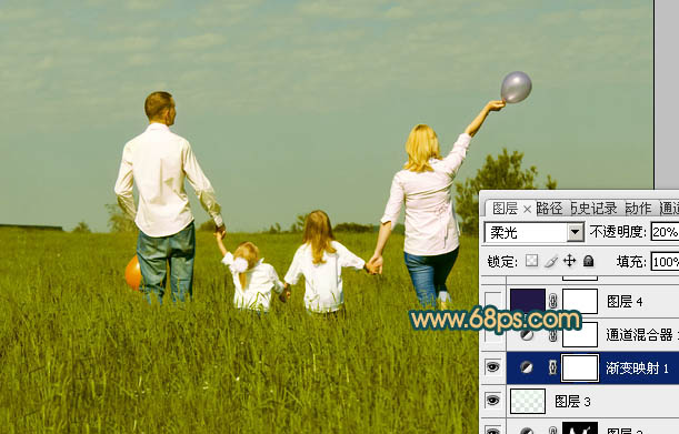 7、创建渐变映射调整图层,颜色设置如图13,确定后把图层混合模式改为“柔光”,不透明度改为:20%。这一步是给图片加上一些补色,增强画面层次感。