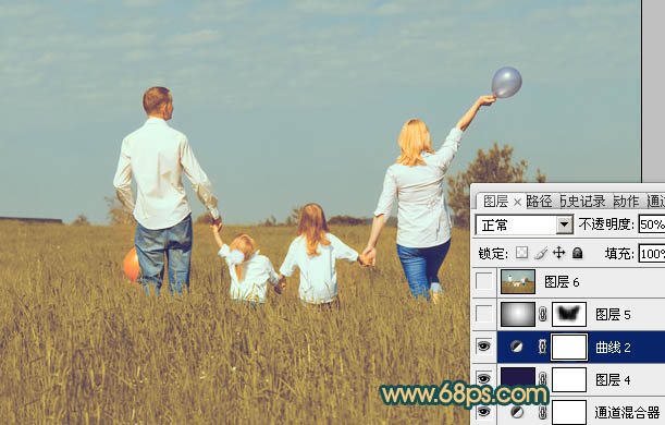 10、创建曲线调整图层,对蓝色进行调整,参数设置如图19,确定后把图层不透明度改为:50%,效果如图20。