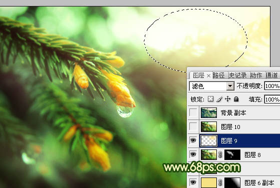 14、新建一个图层,混合模式改为“滤色”,把前景颜色设置为:#F6E283,用画笔把下图选区部分涂上高光。