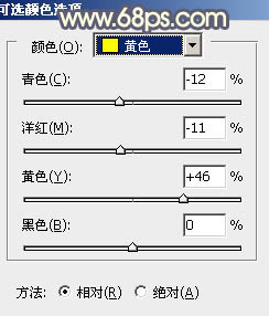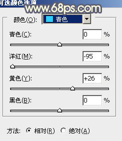 2、创建可选颜色调整图层,对黄,青进行调整,参数设置如图6,7,效果如图8。