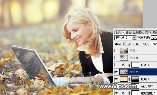 5、按Ctrl + Alt + ~ 调出高光选区,按Ctrl + Shift + I 反选,新建一个图层填充颜色:#402B4D,混合模式改为“颜色减淡”,不透明度改为:30%,效果如下图。