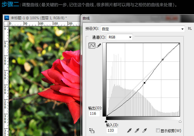 2、创建曲线调整图层,对RGB进行调整。记住这个曲线,很多照片都可以用与之相仿的曲线来处理。