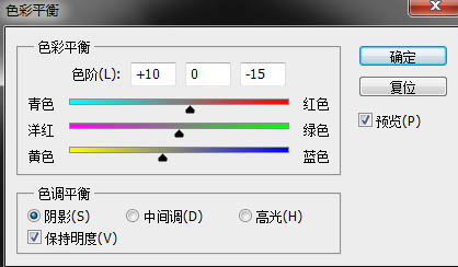 3、创建色彩平衡调整图层,这一步要视图片的总体情况而定,例如现在这幅图总体看起来偏紫,于是就用色彩平衡把画面调得偏黄一点。这一步很大程度上取决于个人喜好。而且也没有固定的数值可言,凭感觉。