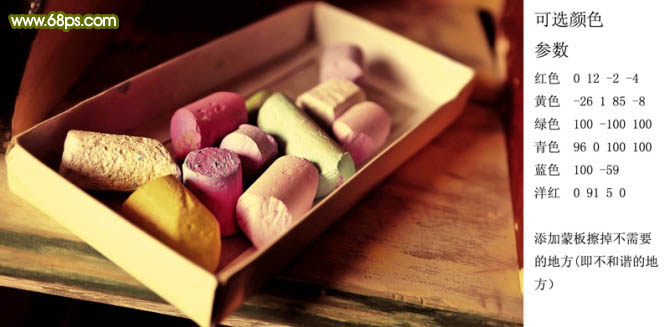 3、创建可选颜色调整图层数值:红:0/12/-2/-4;黄色:-26/1/85/-8;绿:100/-100/100;青色:96/0/100/100;蓝:100/-59/0/0;洋红:0/91/5/0。