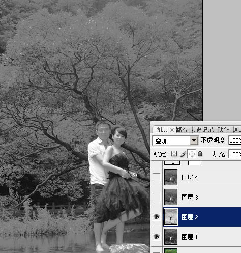 2、按Ctrl + J 把“图层1”复制一层得到“图层2”,按Ctrl + I 反相,图层混合模式改为“叠加”,效果如下图。