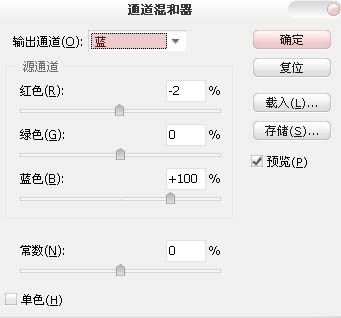 8、创建通道混合器调整图层,对蓝色进行调整,参数设置如下图。