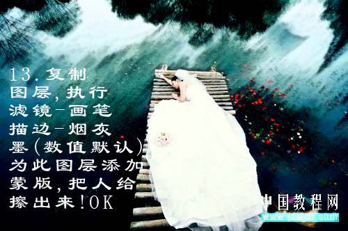 9、新建一个图层,盖印图层。执行:滤镜 > 画笔描边 > 烟灰墨,数值默认。确定后添加图层蒙版,用黑色画笔把人物部分擦出来,完成最终效果。