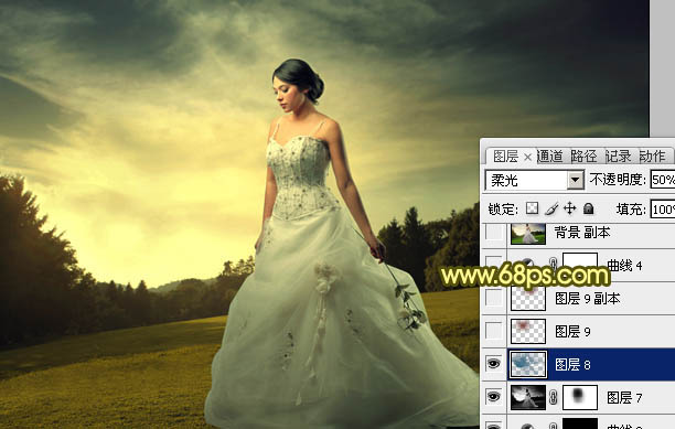 11、新建一个图层,盖印图层。按Ctrl + Shift + U 去色,按Ctrl + M 稍微调暗一点。混合模式改为“正片叠底”,不透明度改为:30%,加上图层蒙版,用黑色画笔把中间部分擦出来,效果如下图。