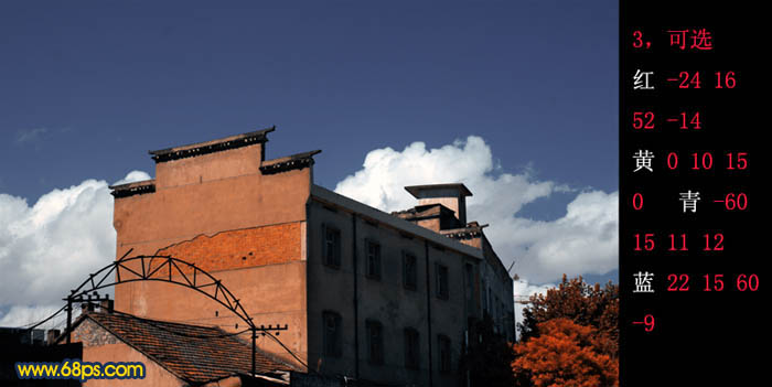 3、创建可选颜色调整图层,参数设置:红:-24/16/52/-14;黄:0/10/15/0;青:-60/15/11/12;蓝:22/15/60/-9。