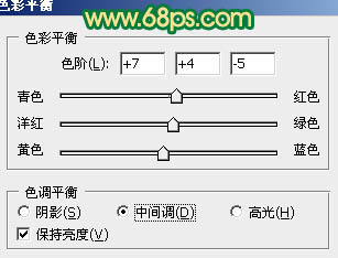 10、创建色彩平衡调整图层,对中间调进行调整,参数设置如图20,效果如图21。