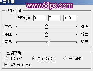 10、创建色彩平衡调整图层,对中间调进行调整,参数设置如图17,效果如图18。