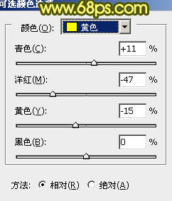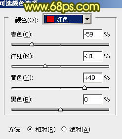 8、创建可选颜色调整图层,对红,黄进行调整,参数设置如图14,15,效果如图16。