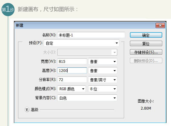 1、新建画布,尺寸如图所示。