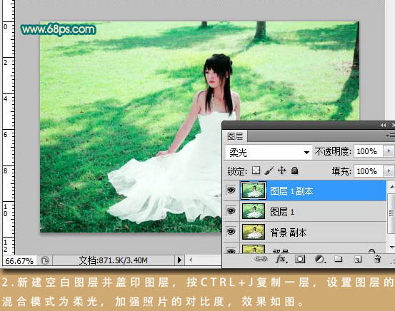 2、新建一个图层,按Ctrl + Alt + Shift + E 盖印图层。按Ctrl + J 把盖印图层复制一层,图层混合模式改为“柔光”,加强照片的对比度。
