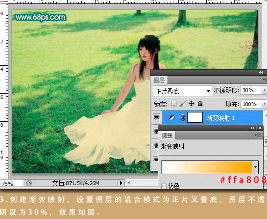 3、创建渐变映射调整图层,设置图层混合模式改为“正片叠底”,图层不透明度设为:30%,效果如下图。