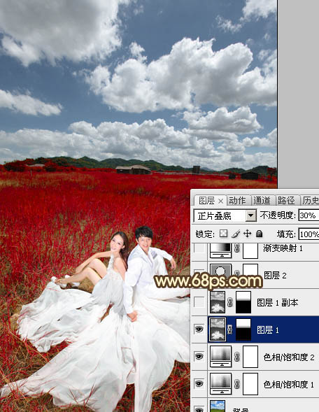 2、新建一个图层,按Ctrl + Alt + Shift + E 盖印图层。按Ctrl + Shift + U 去色,图层混合模式改为“正片叠底”,不透明度改为:30%,加上图层蒙版只保留天空部分,其它部分用黑色画笔擦掉。