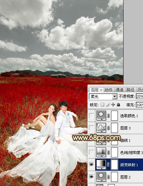 5、创建渐变映射调整图层,颜色设置如图9,确定后把图层混合模式改为“柔光”,不透明度改为:20%,如图10。
