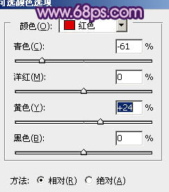 14、创建可选颜色调整图层,对红色进行调整,参数设置如图24,效果如图25。
