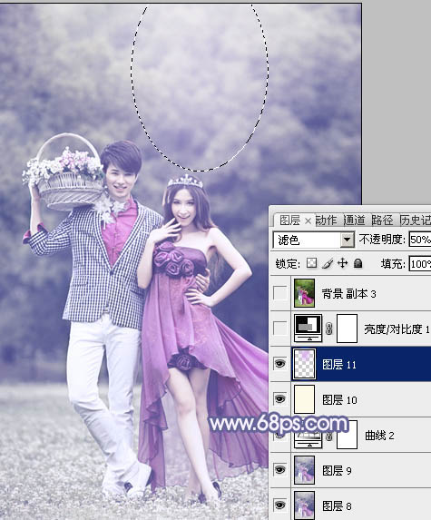16、新建一个图层,图层混合模式改为“滤色”,不透明度改为:50%,把前景颜色设置为:#D8ADEE,用画笔把下图选区部分涂上高光。