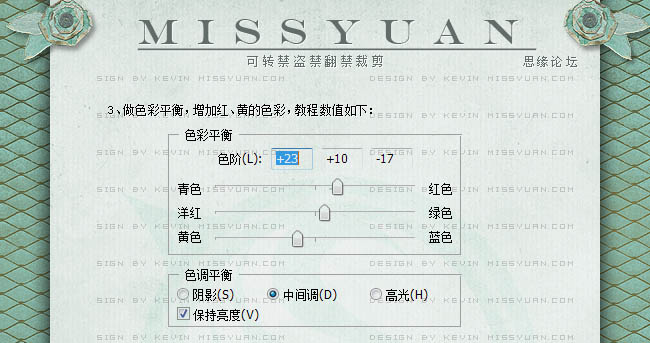 3、创建色彩平衡调整图层对中间调进行调整,增加红、黄的色彩,参数如下图。