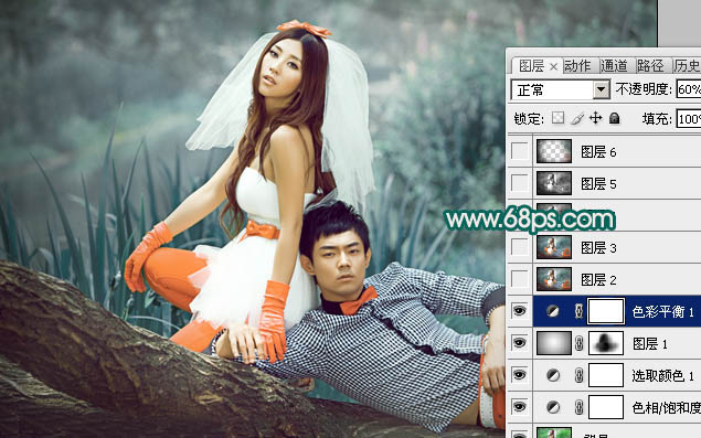 4、创建色彩平衡调整图层,对高光进行调整,参数设置如图6,确定后把图层不透明度改为:60%,效果如图7。