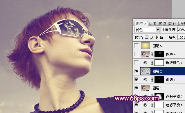6、按Ctrl + Alt + ~ 调出高光选区,按Ctrl + Shift + I 反选,新建一个图层填充颜色:#53176D,图层混合模式改为“滤色”,不透明度改为:20%,效果如下图。