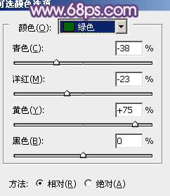 2、创建可选颜色调整图层,对黄,绿进行调整,参数设置如图3,4,确定后按Ctrl + J 把当前可选颜色调整图层复制一层,不透明度改为:20%,效果如图5。