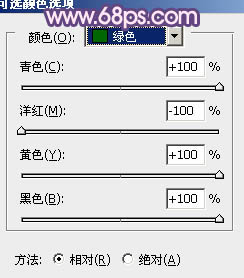 4、创建可选颜色调整图层,对红,绿进行调整,参数设置如图8,9,效果如图10。
