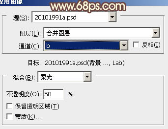 11、新建一个图层,盖印图层。选择菜单:图像 > 模式 > Lab颜色,选择不合拼。执行:图像 > 应用图像,参数设置如图19,效果如图20。