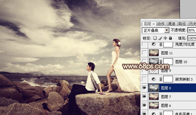 13、新建一个图层,盖印图层。按Ctrl + Shift + U 去色,图层混合模式改为“正片叠底”,不透明度改为:30%,效果如下图。
