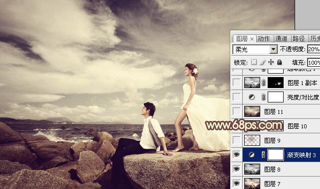 14、创建渐变映射调整图层,颜色设置如图24,确定后把图层混合模式改为“柔光”,不透明度改为:20%,效果如图25。