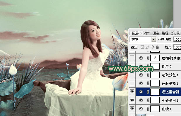 3、创建通道混合器调整图层,对蓝色进行调整,参数设置如图5,效果如图6。