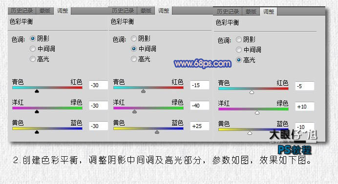 2、创建色彩平衡调整图层,对阴影、中间调、高光进行调整,参数及效果如下图。