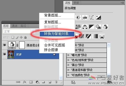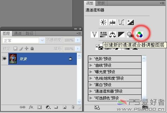 1、打开原图素材,选择菜单:菜单栏——窗口——调整。将调整工具栏调出,单击“通道混合器调整图层”。