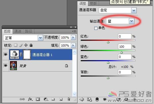 2、进入“蓝”通道,将红色和蓝色设为0,绿色设为100。