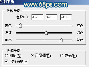 11、创建色彩平衡调整图层,对中间调进行调整,参数设置如图25,确定后用黑色画笔把人物脸部及肤色部分擦出来,效果如图26。