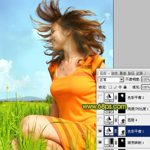 6、创建色彩平衡调整图层,对中间调及高光进行调整,参数设置如图10,11,确定后用黑色画笔把人物部分擦出来,效果如图12。