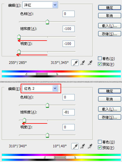 10、此时发现画面右上角天空处依残留有洋红成分,需要去除。创建色相/饱和度调整图层,分别对洋红和红色给予降饱和度和明度处理,参数设置如下图。