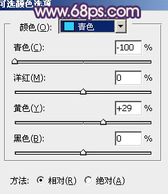 12、调出人物选区,创建可选颜色调整图层,对红,青进行调整,参数设置如图24,25,效果如图26。