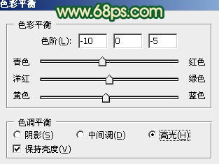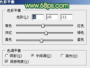 5、创建色彩平衡调整图层,对阴影、中间调、高光进行调整,参数设置如图11 - 13,效果如图14。