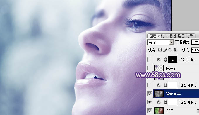 2、把背景图层复制一层,按Ctrl + Shift + ] 置顶,按Ctrl + Shift + U 去色,图层混合模式改为“变亮”,不透明度改为:20%,效果如下图。
